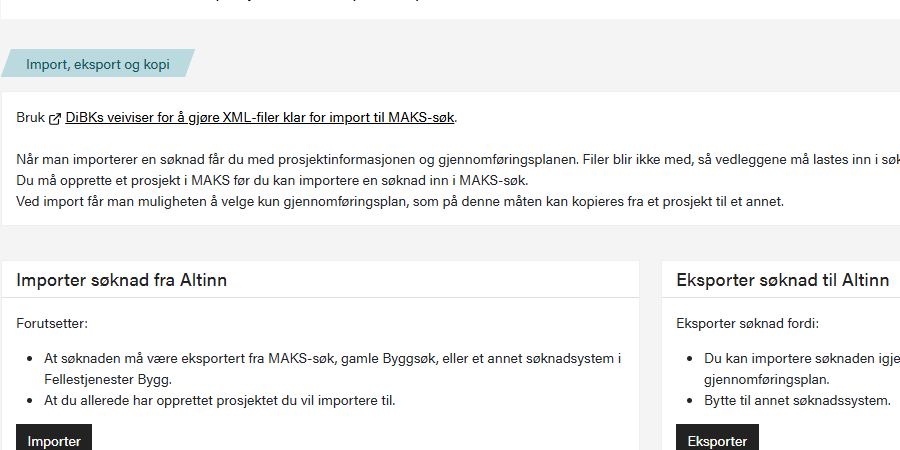 - Du kan kopiere søknad og/eller gjennomføringsplan fra ett prosjekt til et annet. Da benytter du Import/eksport på startsiden i MAKS-søk. Merk at vedlegg og datoer i gjennomføringsplanen ikke følger med.