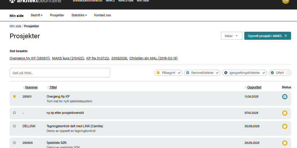 Mange har kanskje allerede oppdaget at det har kommet en ny prosjektoversikt på Min side på arkitektbedriftene.no. Denne siden blir fremover inngangen til prosjektene deres, og vil i første omgang erstatte bedriftens kvalitetsplaner i MAKS.