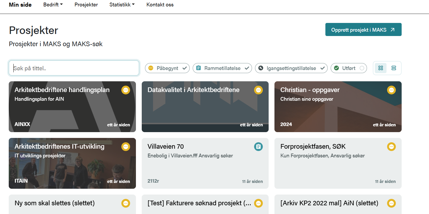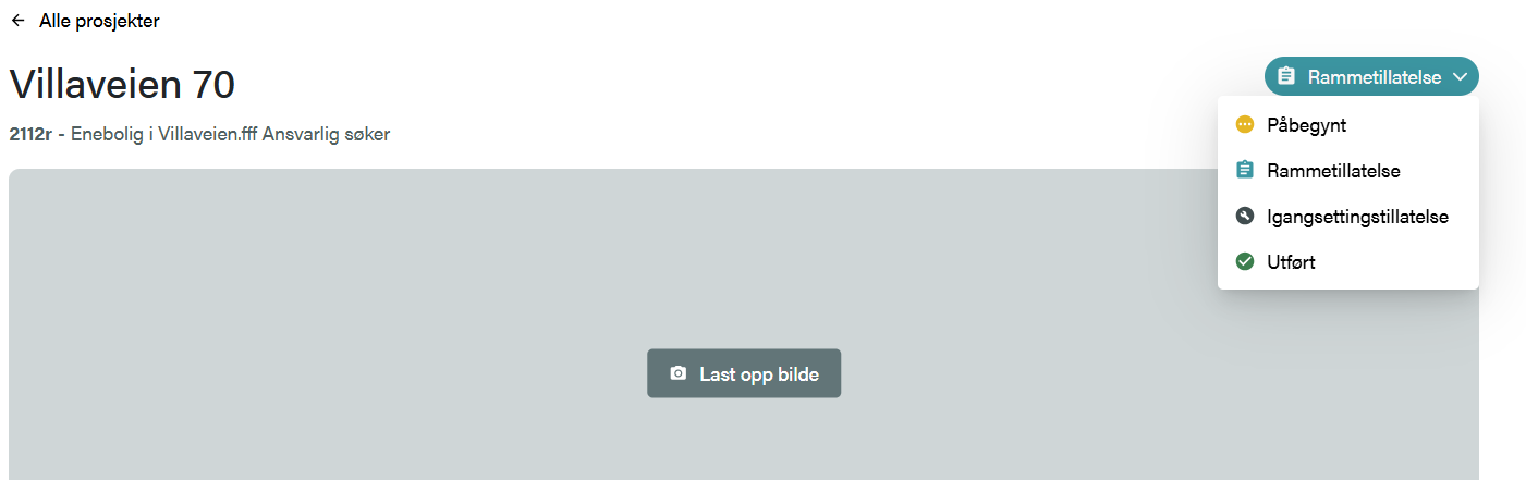 For å holde oversikten ryddig, anbefaler vi å sette prosjektene i ulike statuser og kun ha et begrenset antall aktive prosjekter samtidig. Når et prosjekt er avsluttet, endrer du status til «Utført». Da vil listen over prosjekter i statusene «Påbegynt», «Rammetillatelse» og «Igangsettingstillatelse» bli mer håndterbar. Statusen endres enkelt inne på prosjektets side ved å velge den aktuelle statustypen.