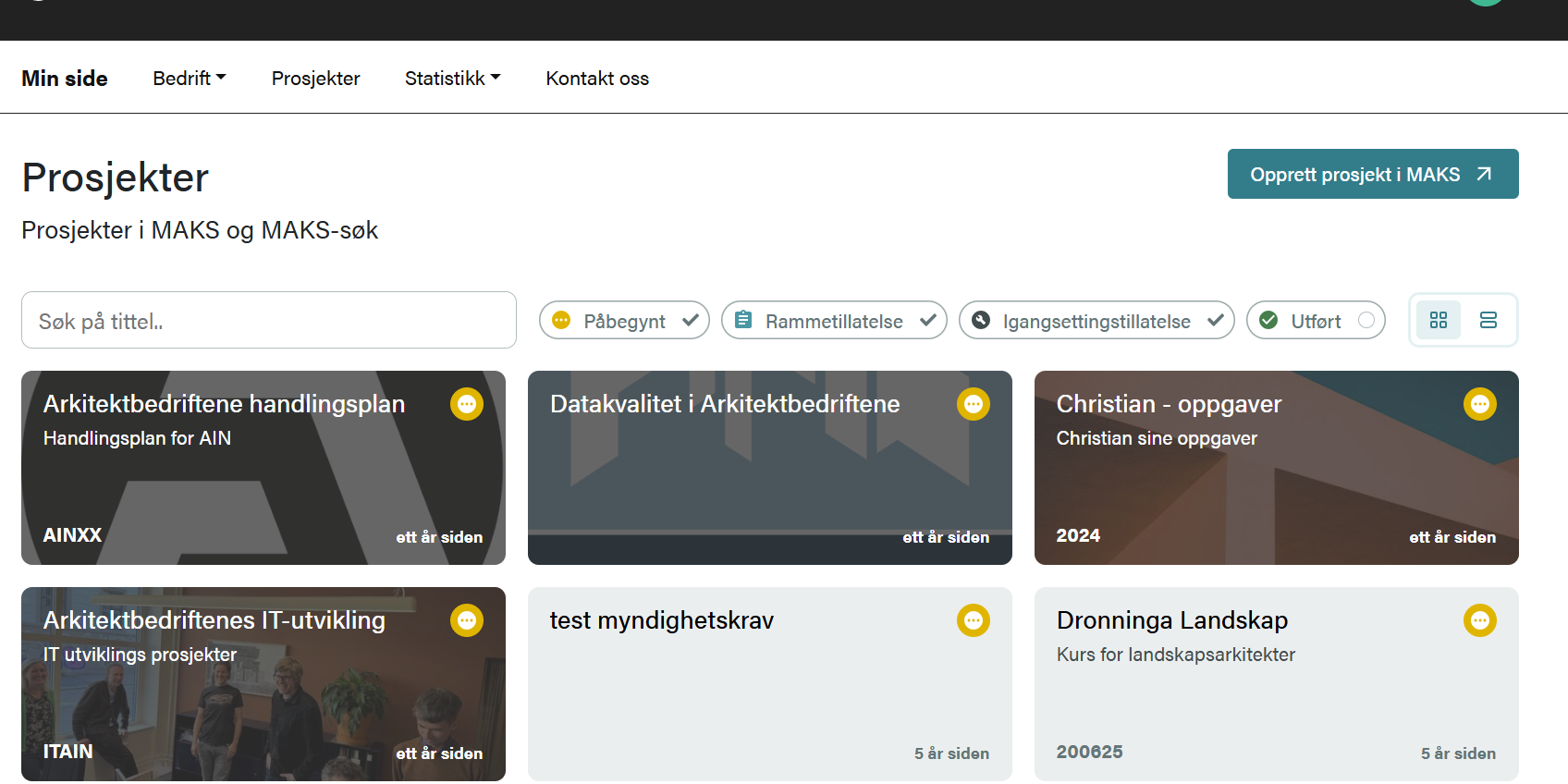Vi har laget en ny prosjektoversikt på Min side. Her kan du søke i prosjekter og gå til de ulike verktøyene.